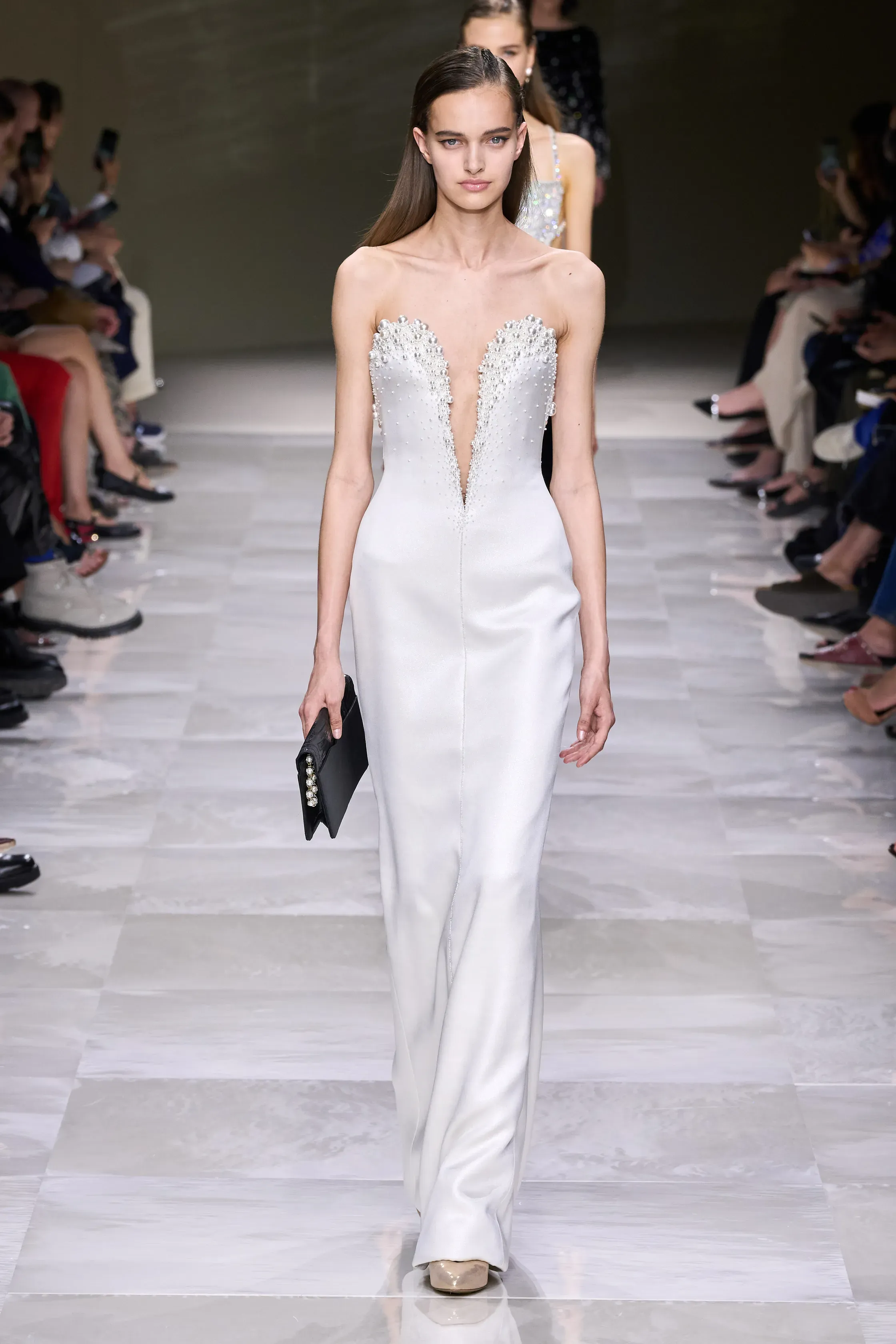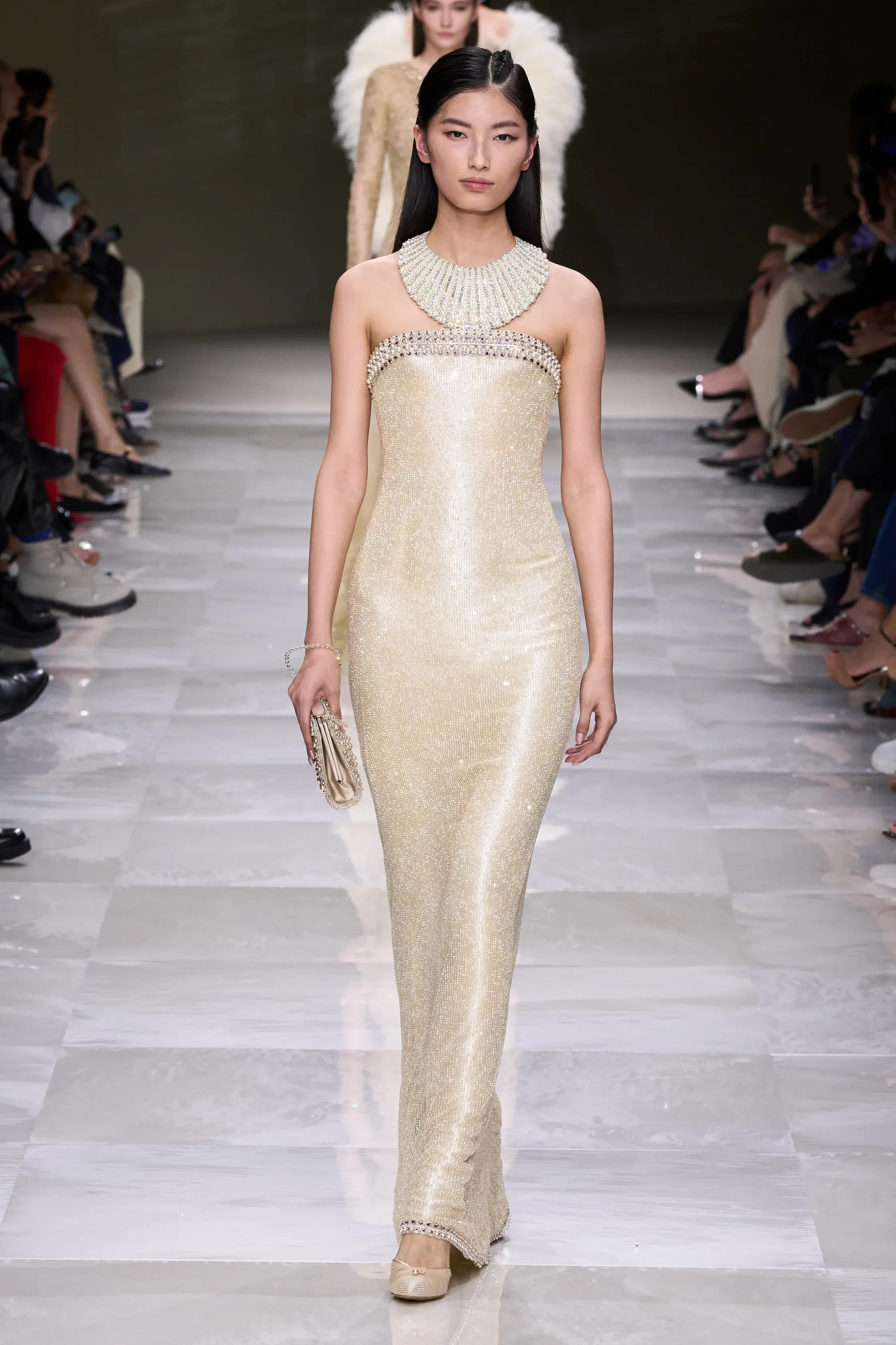 Vestidos elegantes que trazem o glamour dos anos 20 com bordados, pérolas e cristais, mostrou uma mulher que brilha. A inspiração da coleção, as pérolas são associadas a lua, água, sabedoria, pureza e amor.