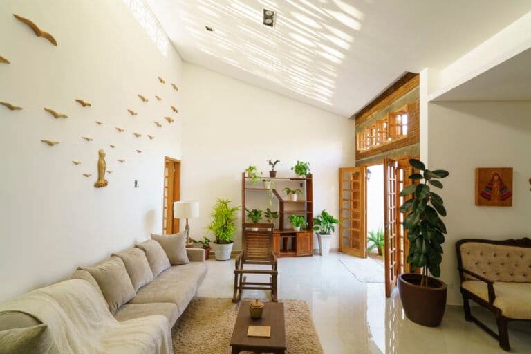 A circulação é fluida. A ventilação resolve o conforto térmico com inteligência passiva. A relação interior–exterior é constante, quase orgânica.