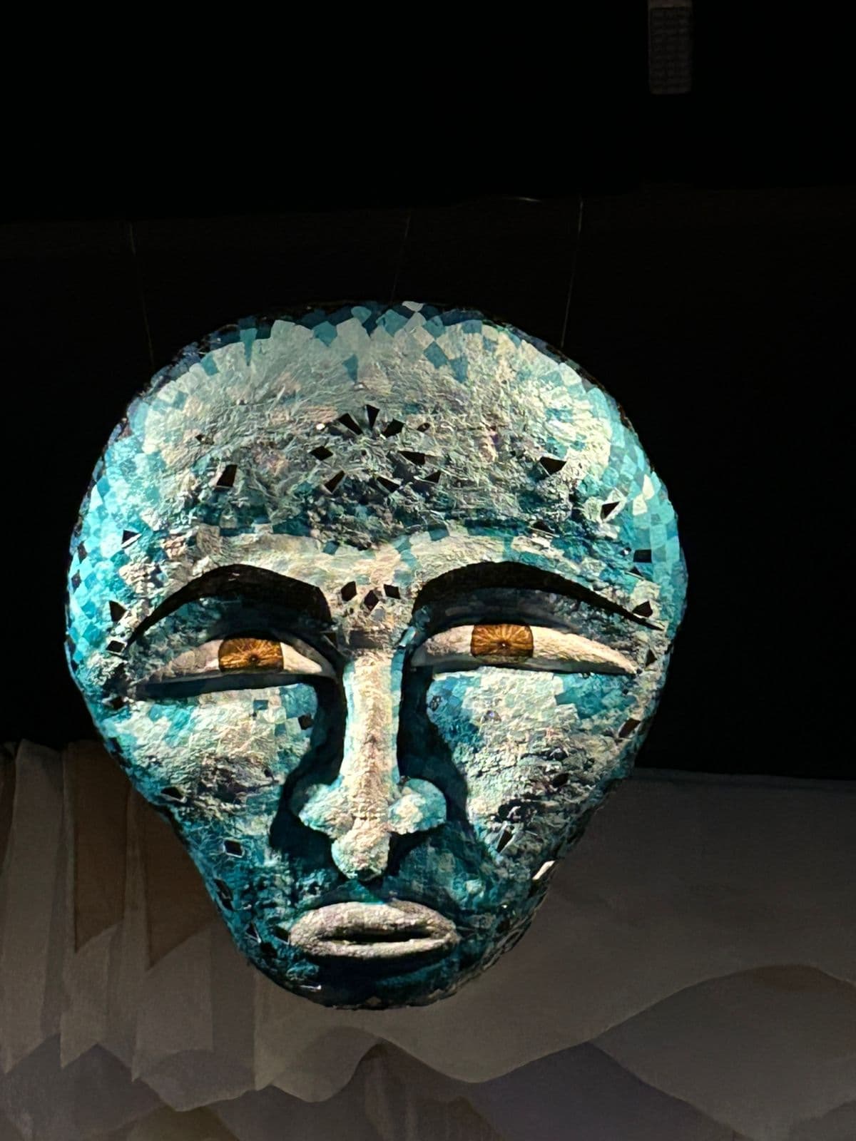 Rosto escultórico suspenso compõe uma das instalações imersivas da exposição (Foto: Arquivo Pessoal)