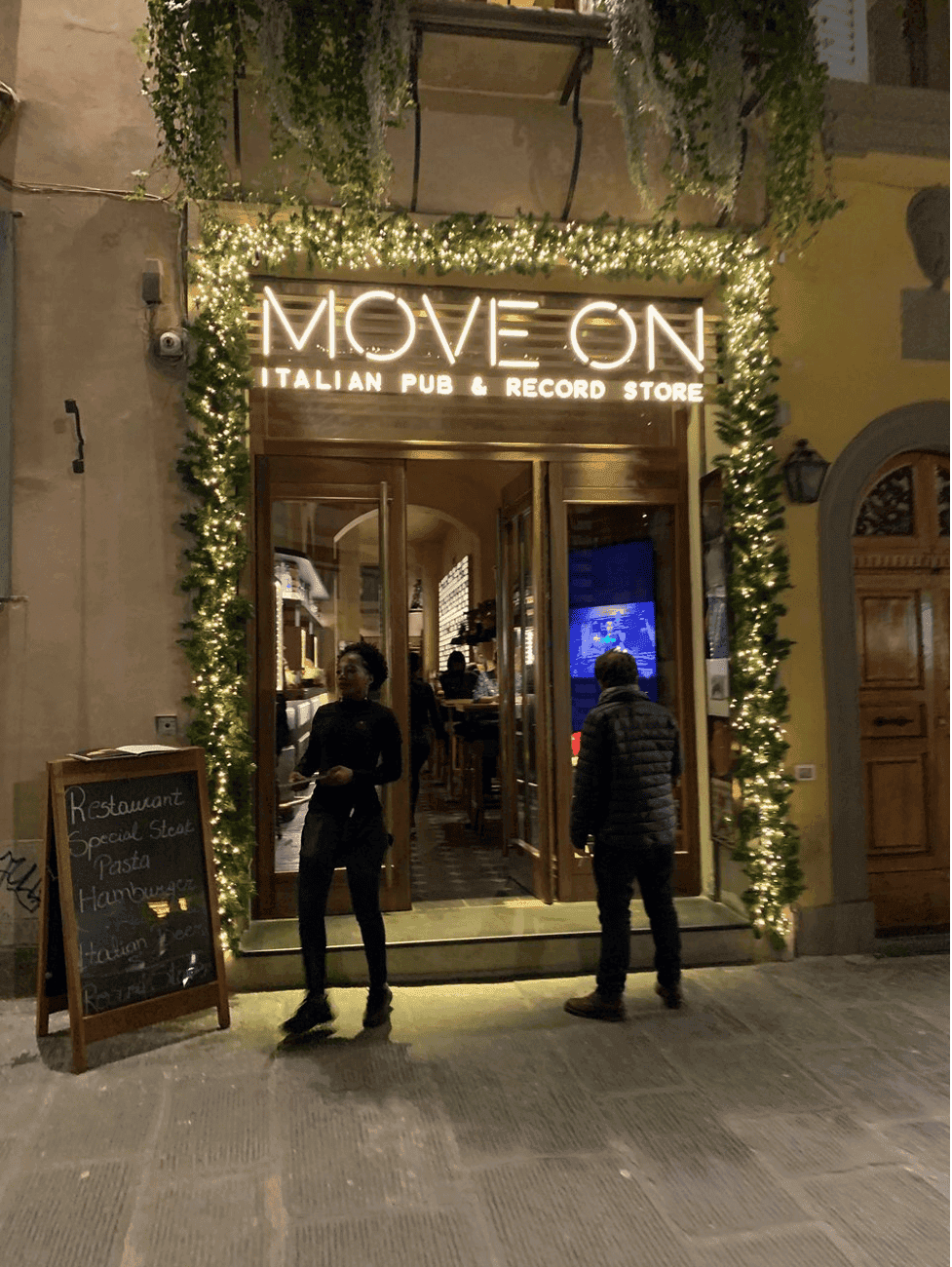 O Move On Bar é bar e loja de discos, possui uma das melhores coleções de discos da Itália, além de oferecer bebidas incríveis, com destaque para o porn-star martini e a tequila. A atmosfera é vibrante, com DJ ao vivo todas as noites e salas privadas com vista para o Battistero di San Giovanni, um dos edifícios mais emblemáticos de Florença. As salas privadas são perfeitas para observar as pessoas e, claro, ser observado.