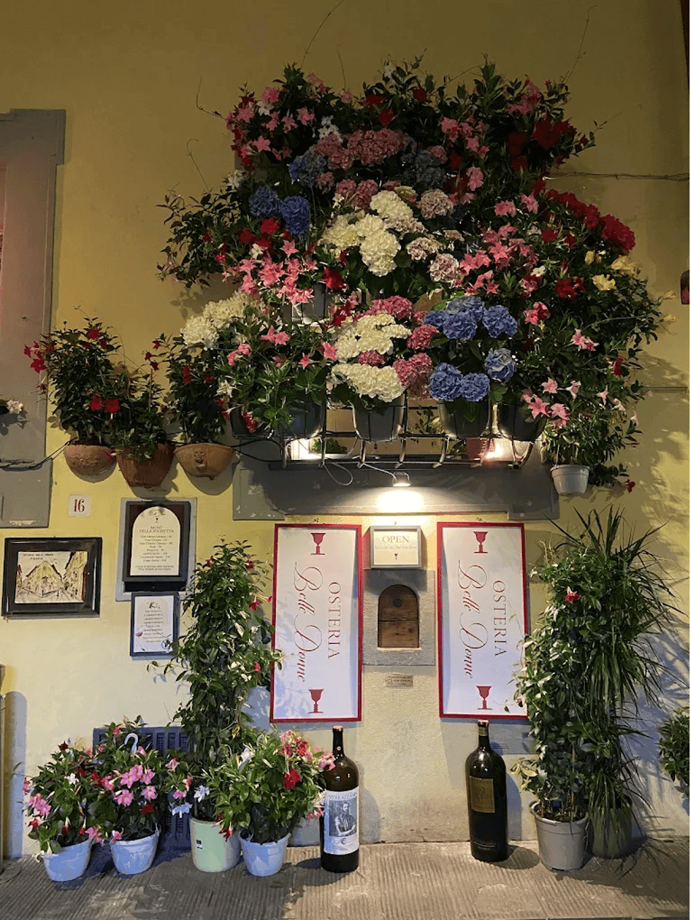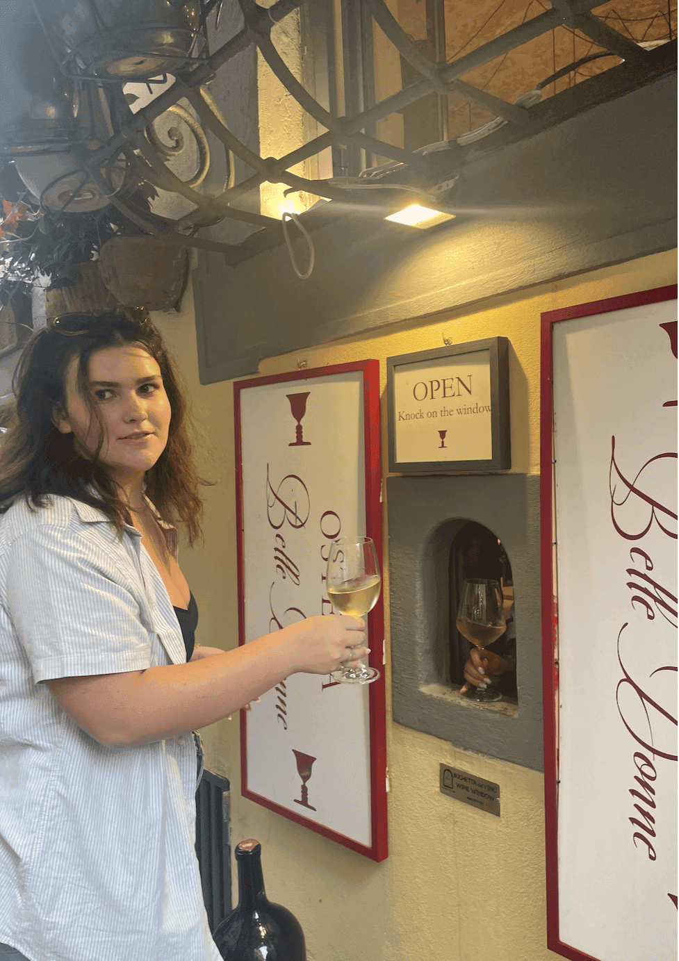 Localizada perto da loja Hermes, a Janela do Vinho se tornou um dos meus lugares favoritos em Florença. O local é perfeito para começar a noite com um Limoncello Spritz ou um Hugo Spritz. Se você optar por vinho, lembre-se de que após as 19h os copos de vinho são trocados por copos de plástico. A história por trás das janelas de vinho remonta à Peste Negra, a praga que se espalhou pela Europa no século XIV. Os trabalhadores costumavam servir comida para os infectados através dessas janelas para evitar serem infectadas, mas hoje em dia se tornou uma atração turística incrível.